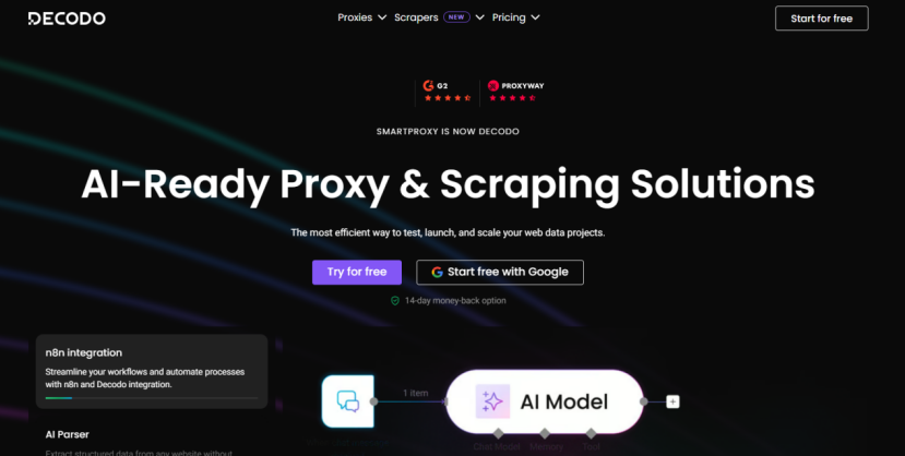 Focused on ease of use and affordability, Decodo is a popular choice for beginners. It offers an intuitive dashboard and browser extensions with flexible traffic-based pricing.