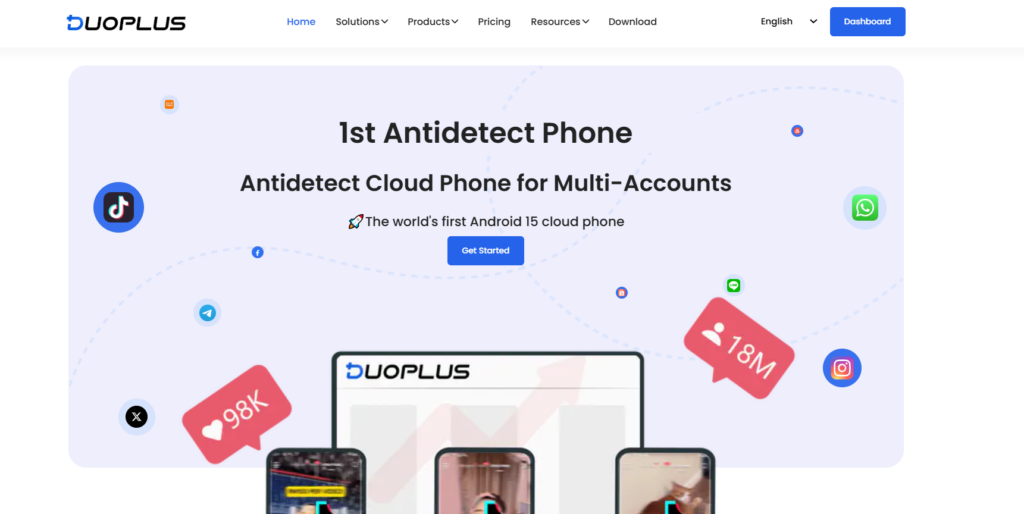 DuoPlus is a cloud phone service designed for overseas social media and cross-border business. It provides isolated Android environments with realistic device parameters, allowing users to manage multiple TikTok, Instagram, Facebook, X, Telegram, and WhatsApp accounts without relying on physical devices.