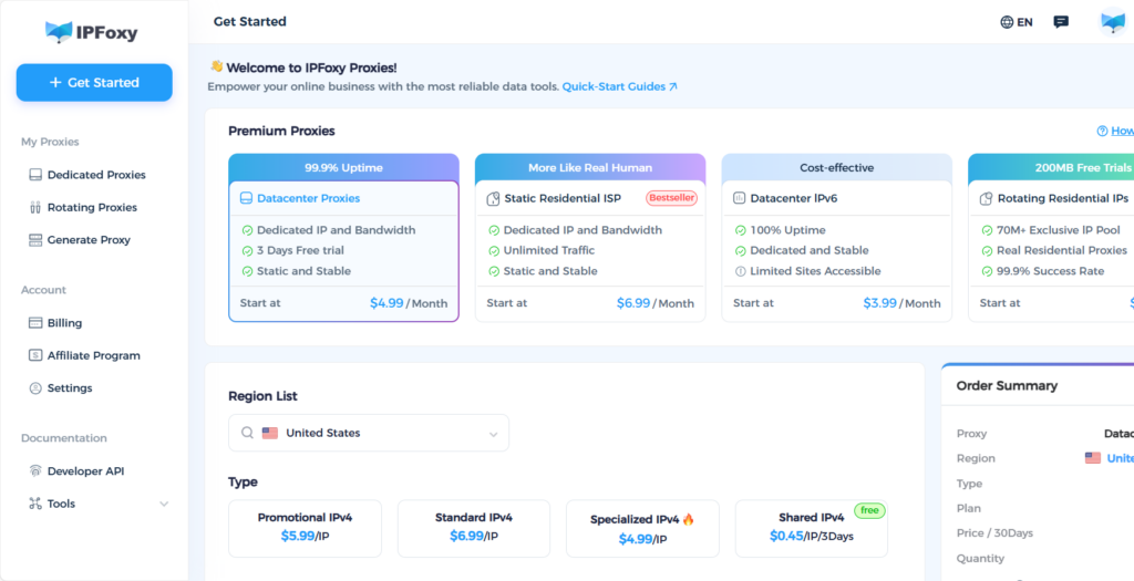 Solution:Avoid public or cloud proxies. Use a dedicated static residential proxy service like IPFoxy. These provide clean, stable IPs from real ISPs, matching a legitimate user’s profile.