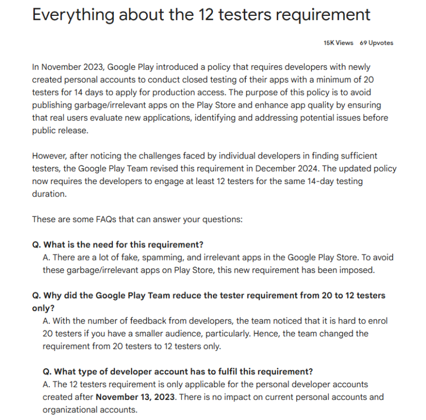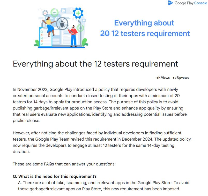 Under the current Google Play review mechanism, new personal developer accounts must complete at least 12 testers and 14 days of closed testing before releasing an app. This is a non-negotiable requirement.
