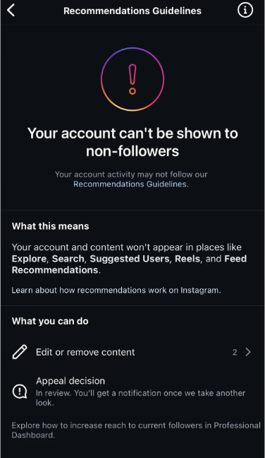 Symptoms: If your reach drops suddenly, your Stories views decrease, and likes and comments diminish with minimal follower growth.