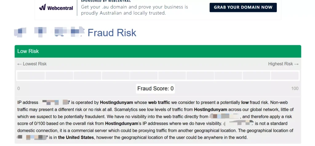 - High fraud score: IPs with risk scores above 75 on platforms like Scamalytics.