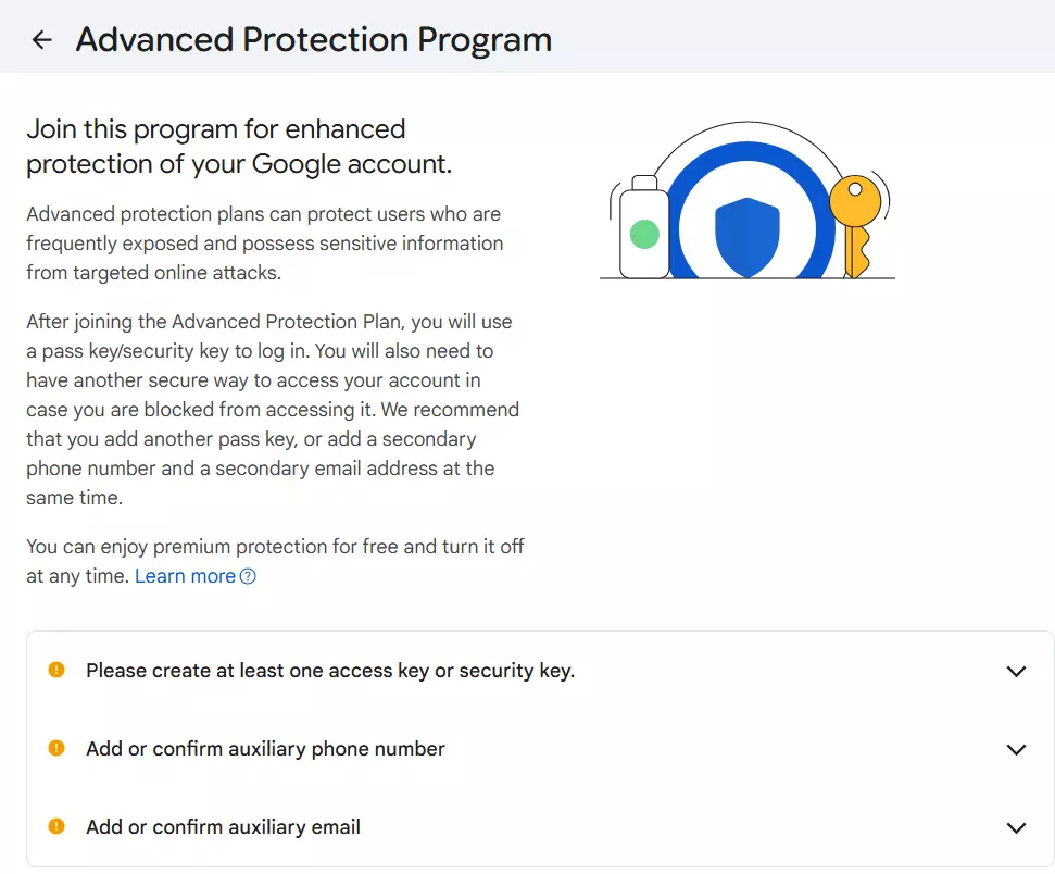 Google’s Advanced Protection Program eliminates the need for phone number verification, replacing it with hardware keys. However, you need at least two hardware keys (like YubiKey), and the account must have no violations.