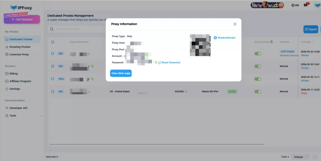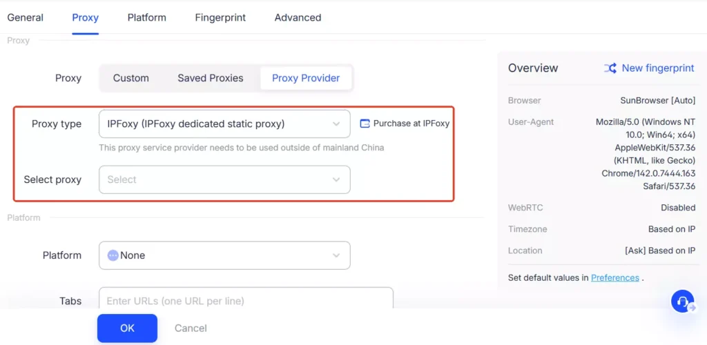 - Anti-detect browser configuration: IPFoxy supports seamless integration with many common Anti-detect browsers. You can quickly configure it under the “proxy information” section.