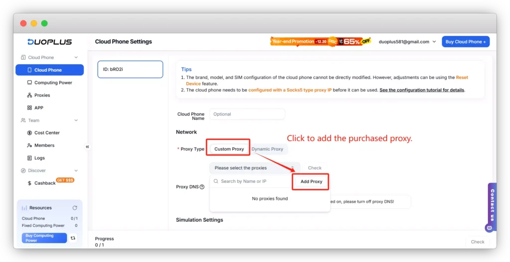 - Cloud phone configuration: Enter the IP, port, and other proxy information provided by IPFoxy in the proxy settings.