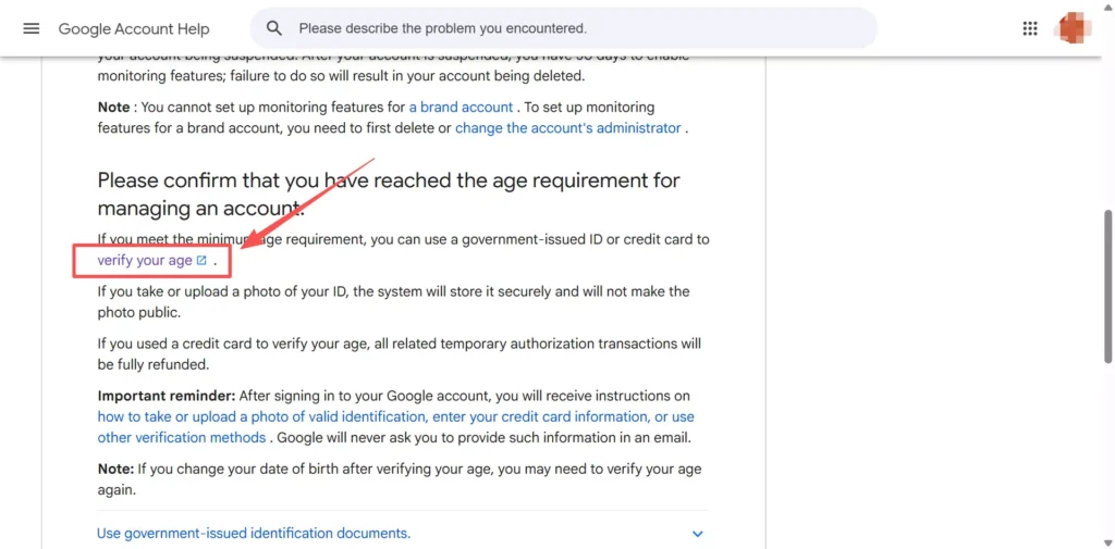 Step 1: Search for age verification on Google, open the Google Account Help Center, and locate the “verify your age” section.
