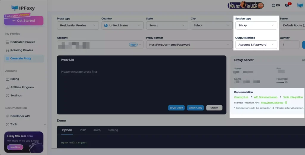 Instead of maintaining your own proxy pool, it’s recommended to use a mature proxy service to reduce operational overhead. For example, providers like IPFoxy offer a large pool of residential proxy IPs with flexible configuration options such as region, rotation frequency, format, and protocol.