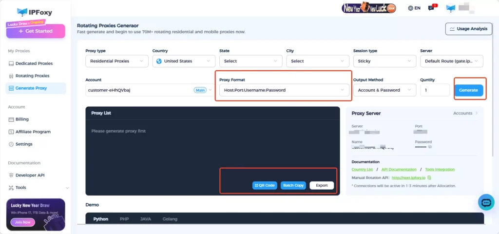 In practice, tools like IPFoxy provide flexible rotating residential proxy solutions that allow you to configure parameters and generate ready-to-use proxy credentials for integration into your scripts.