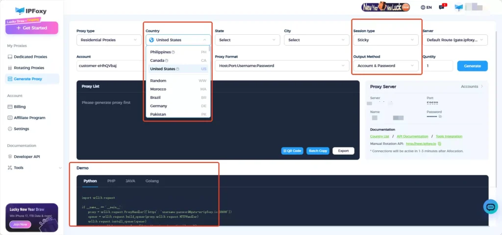 Using IPFoxy’s rotating proxy panel, you can extract parameters such as protocol, region, session interval, and format, then generate proxy credentials for Python. For example, if the proxy is: