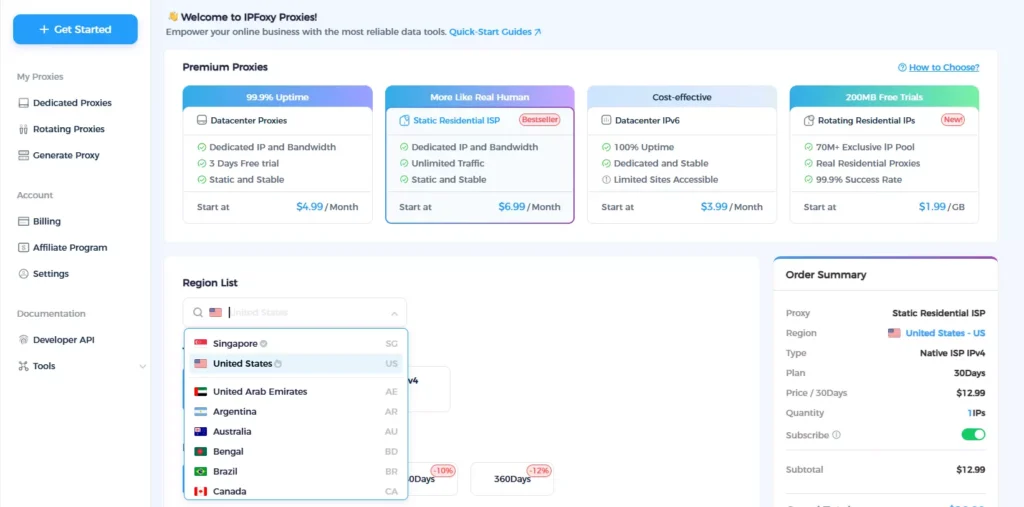 - Use a clean and stable IP: Avoid frequent switching or shared datacenter proxies. A dedicated static residential proxy is recommended. For example, IPFoxy provides high-quality dedicated static residential IPs with strong authenticity and stability, significantly improving account reliability when paired with a fixed device and consistent environment.