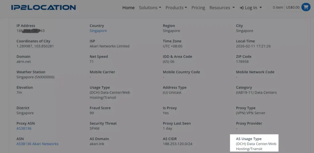 IP Type Testing: Proxy verification tools help check IP attributes, ASN, etc., to confirm the proxy type. For example, ip2location will label residential IPs as “ISP” and server IPs as “Hosting”.